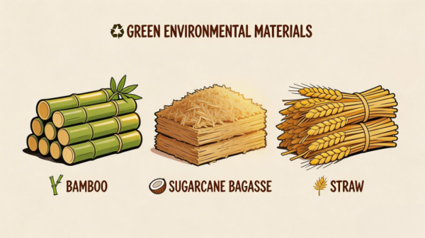 原料广,竹子、甘蔗渣、秸秆都行。碳排放低,生产过程比塑料高温成型节能。