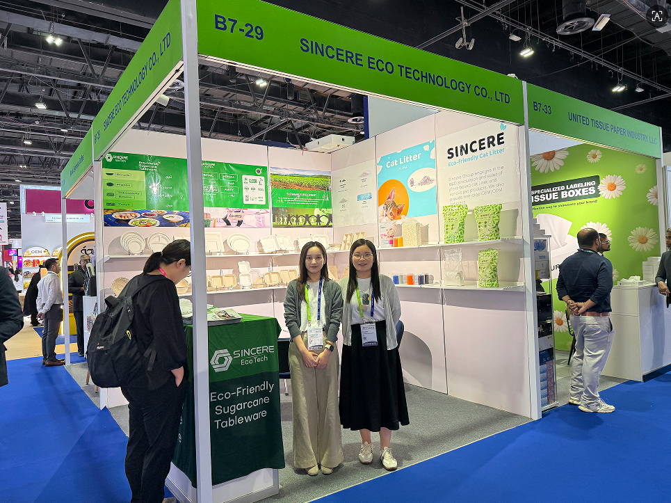 展会期间,多格餐盘与外带打包盒系列成为最受客户关注的“明星产品”。通过餐具产品的“场景化联动展示”,我们向客户传递了 “从餐饮到生活全场景环保解决方案”的理念。除餐具外,同期展出的水晶猫砂、豆腐猫砂、木薯猫砂、膨润土猫砂系列,以“无粉尘、强结团、环保无害”的特性,吸引了宠物用品经销商与家庭用户的双重关注。